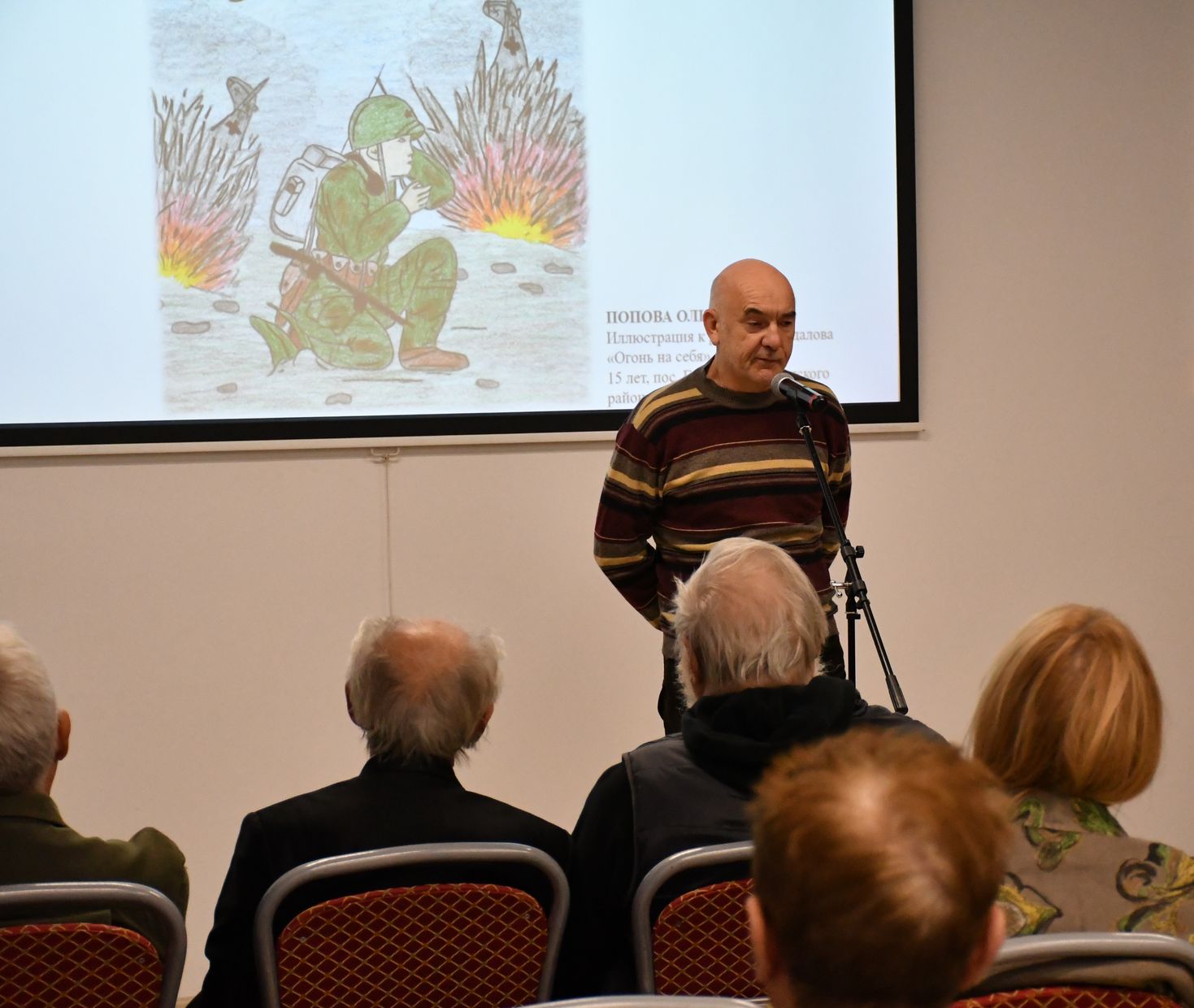 Выступления поэтов были проиллюстрированы детскими рисунками. Это работы участников областного конкурса иллюстраций к произведениям владимирских писателей о Великой Отечественной войне, который прошел по инициативе библиотеки в первом полугодии 2025 года.