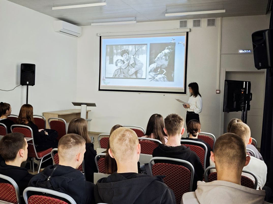 Час мужества «Детство, опаленное войной» был посвящен детям-фронтовикам, которые, не жалея своей жизни, защищали Родину наравне со взрослыми. Они разделили с ними горечь поражений и радость Победы. Во время Великой Отечественной войны насчитывалось 3,5 тысячи юных защитников Родины в возрасте до шестнадцати лет. Они отдали все свои силы и возможности на борьбу с фашистскими захватчиками. На Часе были показаны фрагменты фильмов из известных советских и российских фильмов о детях-героях: «Жила-была девочка», «Зоя», «Сын полка», «Орлёнок», «Иваново детство», «Помни имя своё», «Солдатик». Прозвучали рассказы о судьбах пионеров-героев и сынах полков. Участники лекции — шестиклассники СОШ № 15 и студенты 1 курса юридического факультета Политехнического колледжа — узнали об истории создания увиденных художественных фильмов, снятых как в период военного времени, так в послевоенные годы, а также о современных постановках.