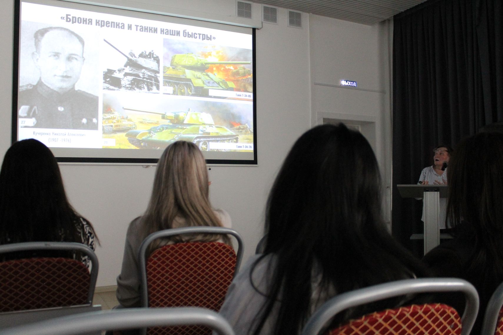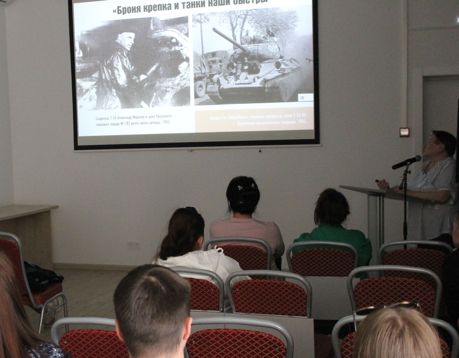 Сотрудники отдела производственной литературы провели исторический час «Легендарное вооружение», во время которого слушатели узнали о знаменитых советских конструкторах и об оружии, которое было создано их упорным, самоотверженным трудом и впоследствии было названо оружием Победы. Слушатели познакомились с образцами стрелкового оружия, разработанного В.А. Дегтяревым, Г.С. Шпагиным, С. Г. Симоновым, А.И. Судаевым. А также узнали о В. Г. Грабине, гении артиллерии, Г. Э. Лангемаке – создателе реактивной артиллерии; конструкторах танка Т-34 – М. И. Кошкине, А. А. Морозове, Н. А. Кучеренко; авиаконструкторах С. М. Ильюшине, С. А. Лавочкине, А. С. Яковлеве.