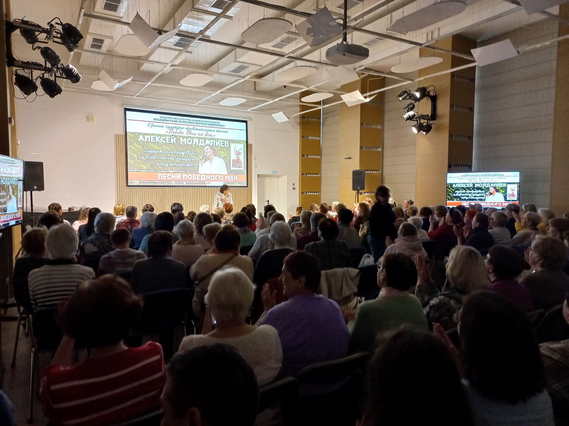 Самое большое музыкальное событие, посвященное Победе в Великой Отечественной войне, состоялось вечером 21 мая — концерт лауреата международных и всероссийских конкурсов, певца и композитора Алексея Молдалиева «Песни победного мая». В зале не было свободного места, ведь каждый, кто хоть раз слышал голос Алексея, стремится попасть на каждый его концерт. Атмосфера, царившая в тот вечер в зале, с трудом поддается описанию: зрители подпевали душевным «Смуглянке» (А. Новиков — Я. Шведов), «Вечеру на рейде» и «Пора в путь-дорогу» (В. Соловьева-Седого, А. Чуркина и С. Фогельсон); вытирали подступившие слезы от песен военной поры «Прощайте, скалистые горы» Е.Жарковского и Н. Букина, «Жди меня» К. Симонова и К. Молчанова, «Где ж ты, мой сад» на слова А. Фатьянова… С комком в горле прослушали песню «Дети войны», созданную поэтом О. Советовой в соавторстве с Алексеем Молдалиевым: это история родителей Алексея, чье детство оказалось опалено пожаром войны… Каждую песню Алексей предварял рассказом о ее создании и судьбе авторов, а исполнял с присущей только ему сердечностью и искренностью. А зрители в ответ несколько раз устраивали овацию любимому артисту, великолепному певцу. Первую и финальную песни зал встретил стоя: «День Победы» и «Я люблю тебя, жизнь».