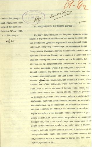 Совета Владимирской Городской Общественной публичной библиотеки о выделении нового помещения для библиотеки*