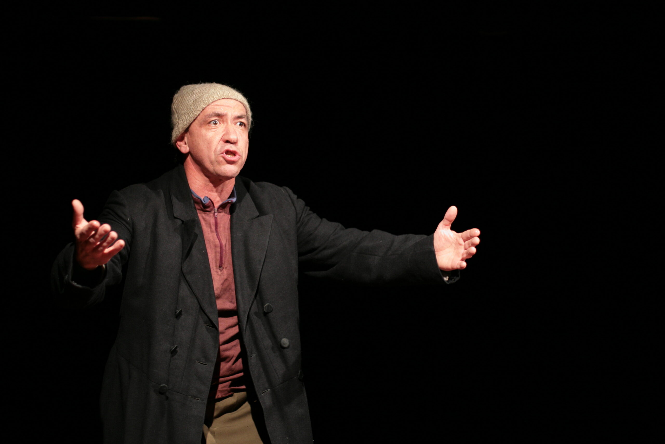 Особенность спектакля в том, что он играется на совершенно разных площадках, от 800 зрителей до 50. При этом важен тот факт, что на момент рассадки зрителей актёр уже «живёт» на сцене внутри условных декораций.