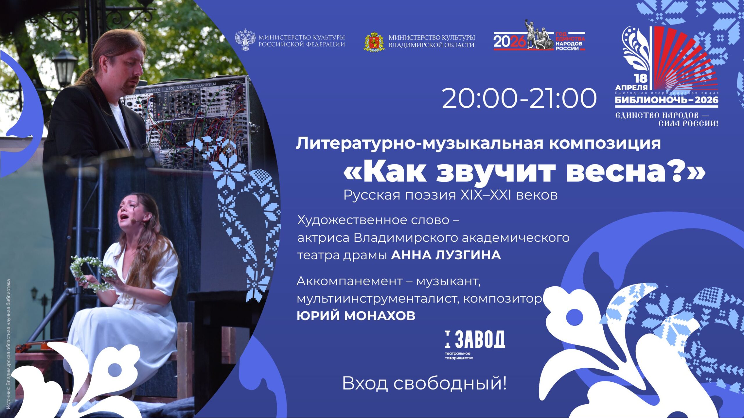 Как звучит весна на Библионочи-2026? Русская поэзия 19–21 веков в исполнении ведущей артистки Владимирского академического театра Анны Лузгиной под аккомпанемент мультиинструменталиста, композитора Юрия Монахова. Поэтическо-музыкальный перформанс «Как звучит весна?» состоится 18 апреля в 20:00!