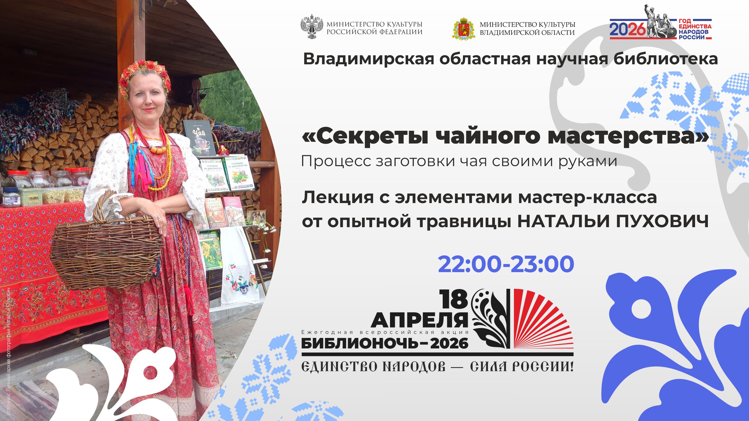 18 апреля в 22:00 во Владимирской областной научной библиотеке — встреча с опытной травницей Натальей Пухович. Вы научитесь заготавливать чай на зиму и освоите искусство чайного купажа. Создайте свой уникальный напиток с нуля — с характером, настроением и вкусом. Будет душевно, ароматно и очень познавательно.