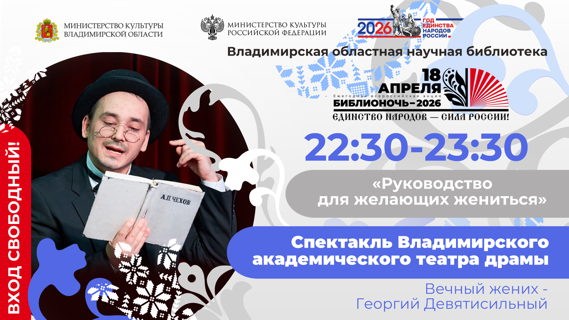 Ждём именно вас на шуточную и ироничную, исповедальную и душевную встречу о «жажде счастья и любви» с прекрасным актером Владимирского академического театра драмы Георгием Девятисильным, который на наших глазах будет перевоплощаться в трогательных и узнаваемых героев из произведений Чехова. И нам всем будет полезно сравнить: что и как думали и делали, чтобы жениться, в XIX веке, и что думают и делают в веке XXI. И почувствовать, как отзываются сейчас в наших сердцах слова Антона Павловича: «В семейной жизни самый важный винт – это любовь… Я понял, что когда любишь, то в своих рассуждениях об этой любви нужно исходить от высшего, от более важного, чем счастье или несчастье, грех или добродетель в их ходячем смысле, или не нужно рассуждать вовсе…».