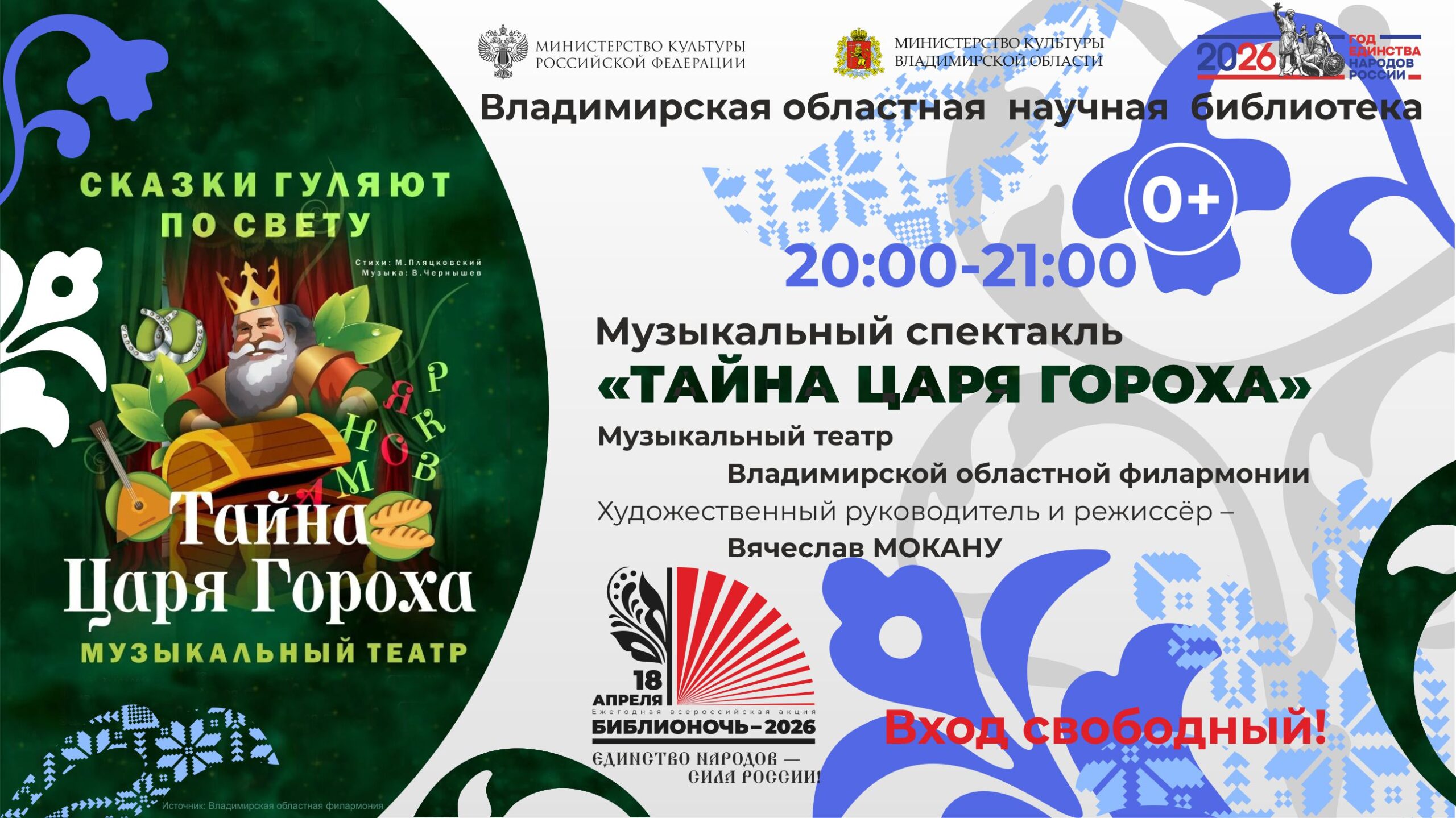 Музыкальный спектакль «Тайна царя Гороха» (6+) от Владимирской областной филармонии на Библионочи-2026 18 апреля в 20:00! Сказочный балаган с музыкой, песнями и прибаутками приглашает наших зрителей всей семьёй отправиться в сказочное путешествие!