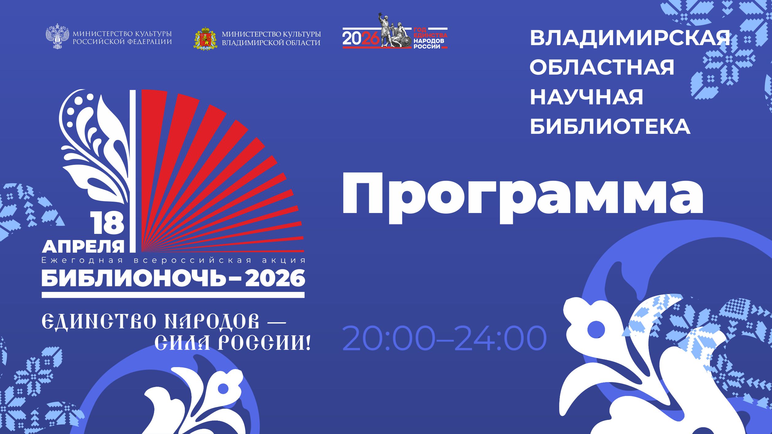 18 апреля 2026 г. пройдет пятнадцатая всероссийская социально-культурная акция «Библионочь», приуроченная к Году единства народов России. Девиз акции – «Единство народов – сила России!»