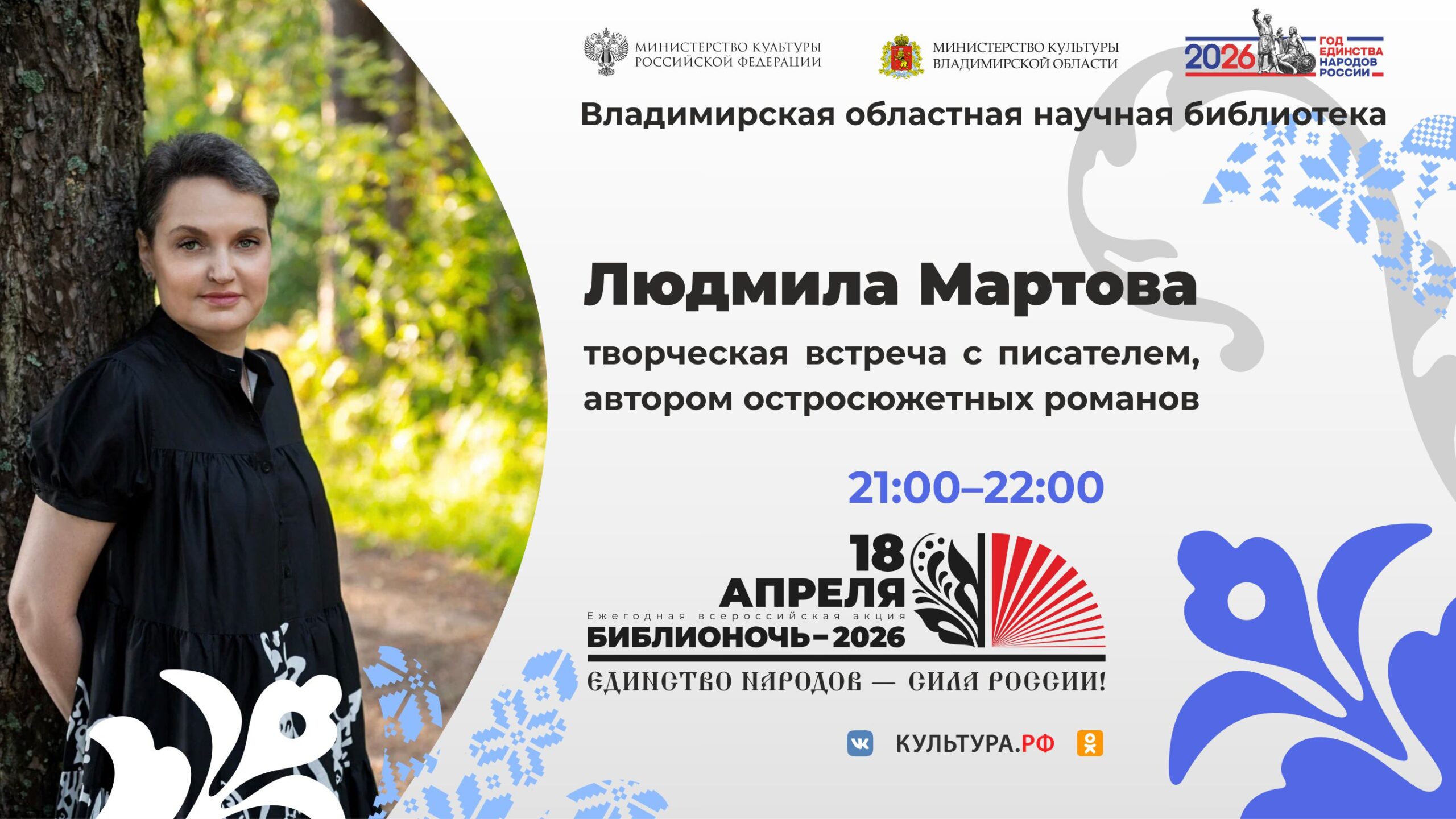 Долгожданная встреча с писателем Людмилой Мартовой, автором остросюжетных романов, которые покорили сердца тысяч читателей и легли в основу тринадцати успешных сериалов, показанных на центральных телеканалах, состоится на Библионочи-2026! Ждём всех, кто увлечен книгами с детективным сюжетом, 18 апреля в 21:00!