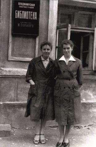 Сотрудники библиотеки Антонина Николаевна Терехина и Фаина Ивановна Задорожная на фоне библиотеки, фото 1960-х гг.