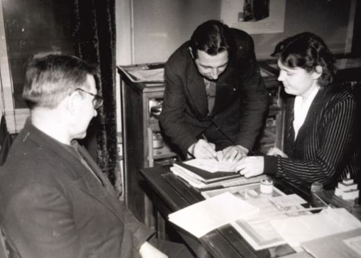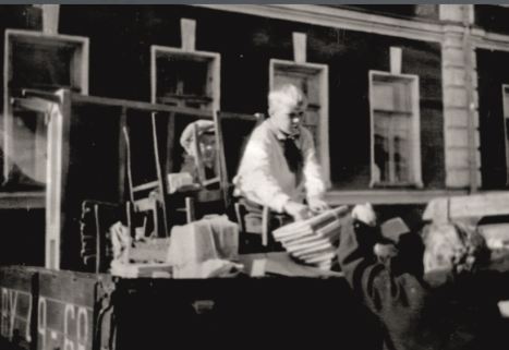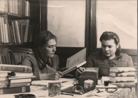 Людмила Петровна Поспелова и Моисеева за приемом новой партии книг, фото 1950-х гг.