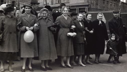 Первомайская демонстрация. В первом ряду: Любовь Марковна Аскадская, Антонина Николаевна Терехина, Фаина Ивановна Задорожная, Лидия Васильевна Евдокимова, Софья Васильевна Михайлова, Анна Ивановна Быстрова, Елизавета Ильинична Смирякова, Евгений Сергеевич Королев. Фото конца 1950-х гг.
