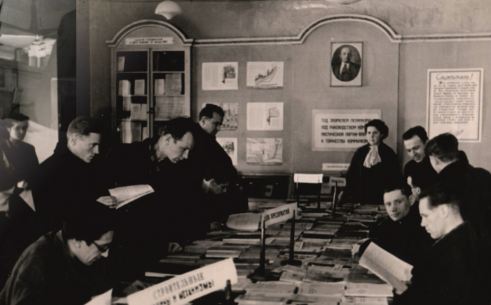 На выставке новой литературы для строителей. Группа инженеров и техников тракторного Завода им. А.А. Жданова. 17 марта 1957 г.