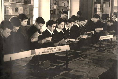 Экскурсия учащихся строительной школы №6 по выставке новой литературы, 1957 г.