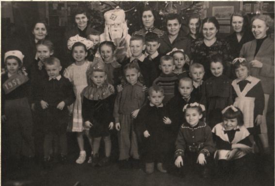 Праздник нового года для детей сотрудников библиотеки. Слева в верхнем ряду — директор Любовь Марковна Аскадская, 1958 г.