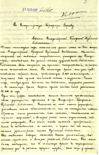 Совета Владимирской Городской Общественной публичной библиотеки в Городскую управу о выделении нового помещения для библиотеки*
