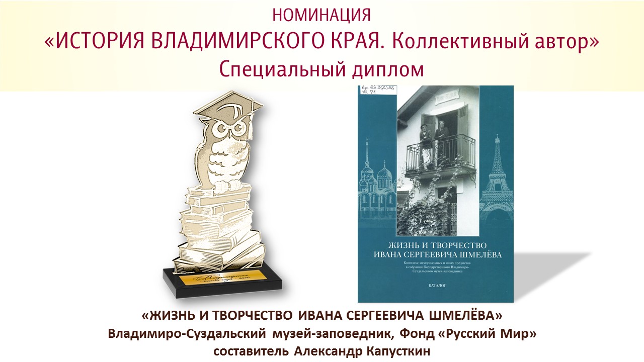 Членами конкурсной комиссии было принято решение наградить специальным дипломом конкурса за уникальный справочный материал в номинации «История Владимирского края. Коллективный автор» книгу «Жизнь и творчество Ивана Сергеевича Шмелева: комплекс мемориальных и иных предметов в собрании Государственного Владимиро-Суздальского музея-заповедника», Владимиро-Суздальский музей-заповедник, Фонд «Русский Мир», составитель Александр Сергеевич Капусткин.
