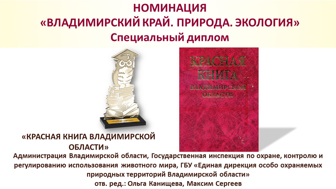 была представлена всего одна книга, ее значение для владимирского краеведения очень значительно, поэтому комиссия приняла решение отметить ее специальным дипломом. Специальный диплом конкурса за уникальный справочный материал в номинации «Владимирский край. Природа, экология» получила «Красная книга Владимирской области», авторы: Администрация Владимирской области, Государственная инспекция по охране, контролю и регулированию использования животного мира и ГБУ «Единая дирекция особо охраняемых природных территорий Владимирской области»; ответственные редакторы: Ольга Канищева, Максим Сергеев.
