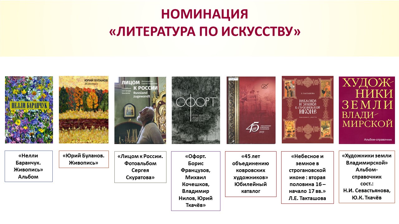 Дипломы номинантов получили книги: «Юрий Буланов. Живопись», автор Юрий Евгеньевич Буланов, «Офорт. Борис Французов, Михаил Кочешков, Владимир Нилов, Юрий Ткачев» Фонд Бориса Французова, редактор Н.А. Молодцова; «45 лет объединению ковровских художников» Ковровское объединение художников (руководитель Владимир Ефимович Тамченко).