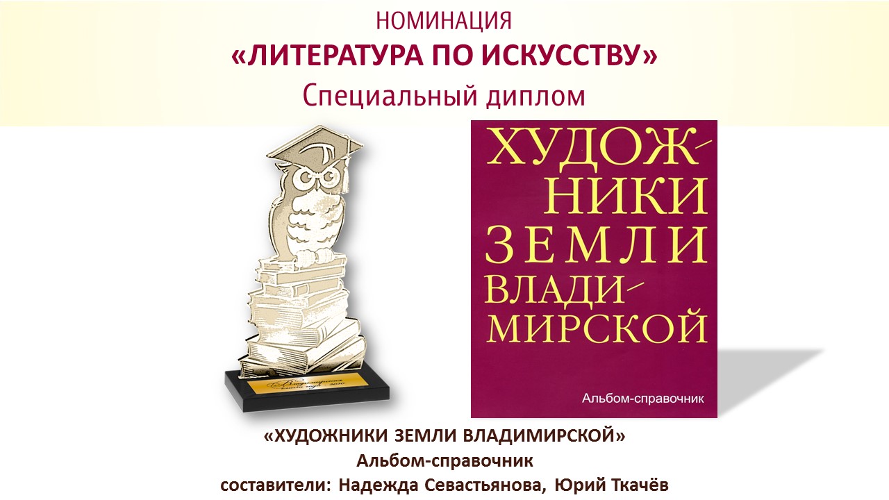 Специальным дипломом конкурса за уникальный справочный материал в номинации «Литература по искусству» жюри отметило альбом-справочник «Художники земли Владимирской», составители: Надежда Игоревна Севастьянова, Юрий Константинович Ткачев.