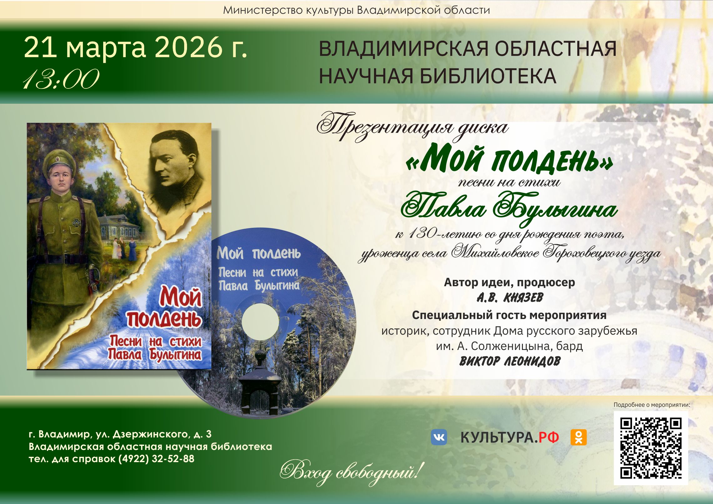 Презентация диска песен на стихи Павла Булыгина «Мой полдень» состоится в областной научной библиотеке 21 марта 2026 г. в 13:00. Диск выпущен к 130-летию со дня рождения поэта, уроженца Владимирской земли.