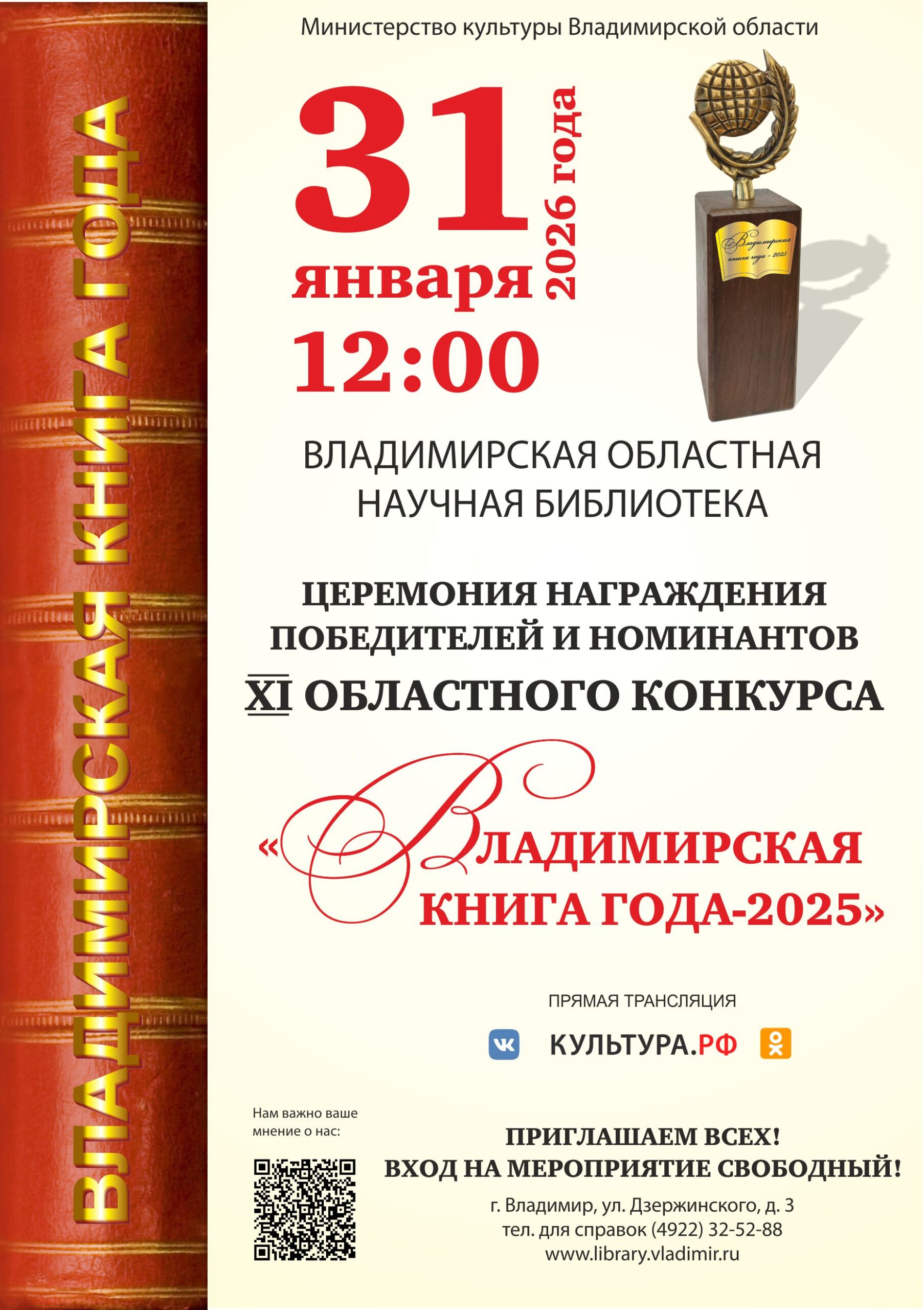 Торжественная церемония награждения конкурса «Владимирская книга года-2025» состоится 31 января 2026 г. в 12:00 во Владимирской областной научной библиотеке! В этот торжественный день Владимирская областная научная библиотека приглашает всех участников ХI Областного конкурса, читателей, группы поддержки авторов и книг в свой большой читальный зал!