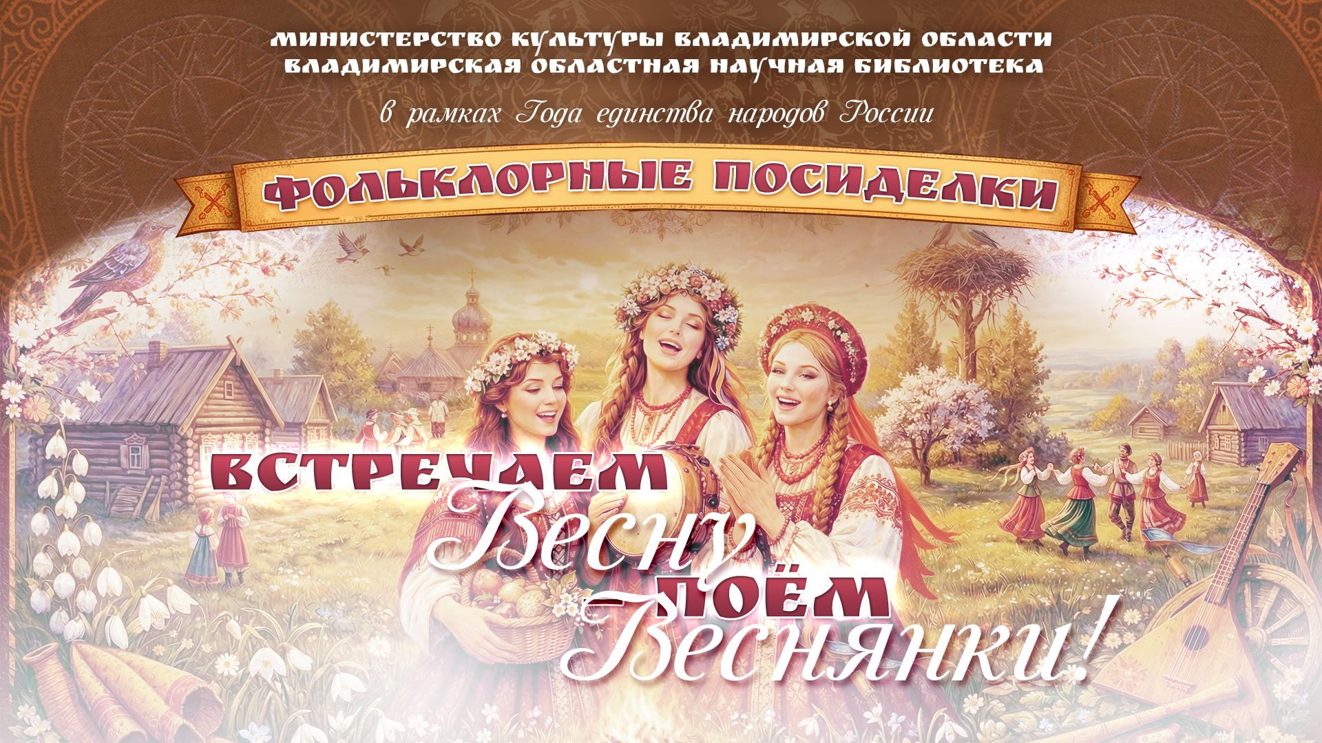 21 марта 2026 года в 14:00 в рамках Года единства народов России приглашаем на фольклорные посиделки «Встречаем Весну — поём Веснянки!» и познакомимся с обычаями призыва Весны у славянских народов.
