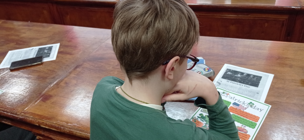 Кроме того, они встретились с ярким персонажем сказок и легенд Ирландии. Лепрекон – маленький «зеленый» человечек, исполняющий заветные желания. Непеременным атрибутом волшебника является горшочек с золотом, который он всегда носит с собой. Одет он тоже всегда только в зеленое. Ребята с удовольствием вырезали из бумаги «зеленые» символы клевера и примеряли на себя. В конце часа, каждый слушатель отгадал кроссворд по Ирландии и получил небольшой сувенир зеленого цвета.