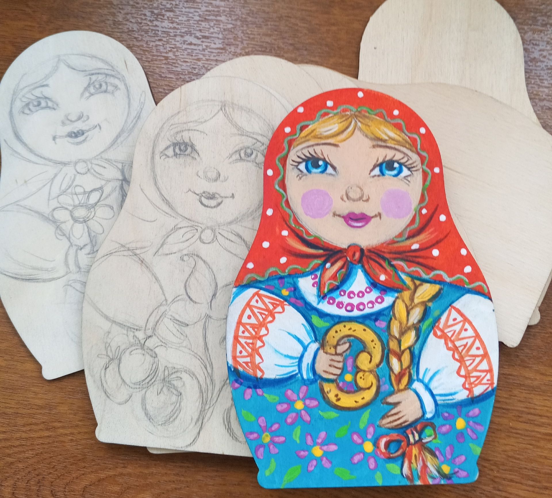 Мастер-класс будет проводиться на плоской деревянной основе в форме матрёшки размером 9,5×14,5 и 16×9. Работа ведётся гуашевыми красками на водной основе. На каждой заготовке необходимо будет выполнить эскиз карандашом, как на образце.