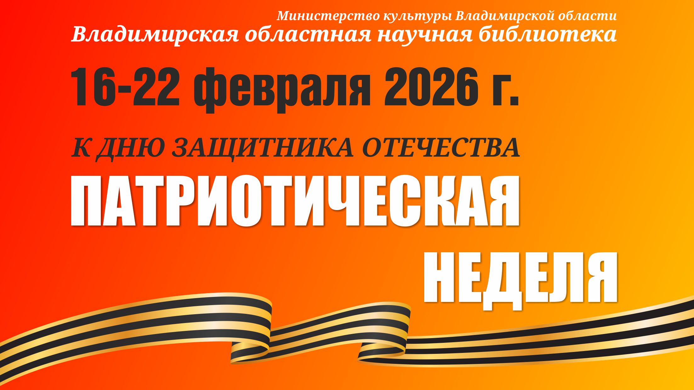 Патриотическая неделя ко Дню защитника Отечества проводится Владимирской Областной научной библиотекой 16-22 февраля 2026 г. накануне празднования Дня Защитника Отечества. Приглашаем группы учащихся школ, вузов, колледжей и всех желающих к участию в командных играх и викторинах, литературных марафонах и экскурсиях по выставкам книг и оружия, а также в творческих встречах с поэтами-фронтовиками, ветеранами СВО.