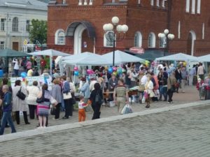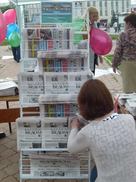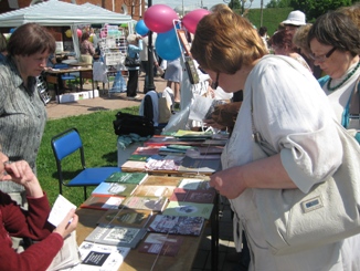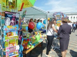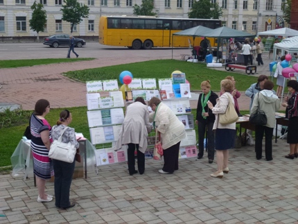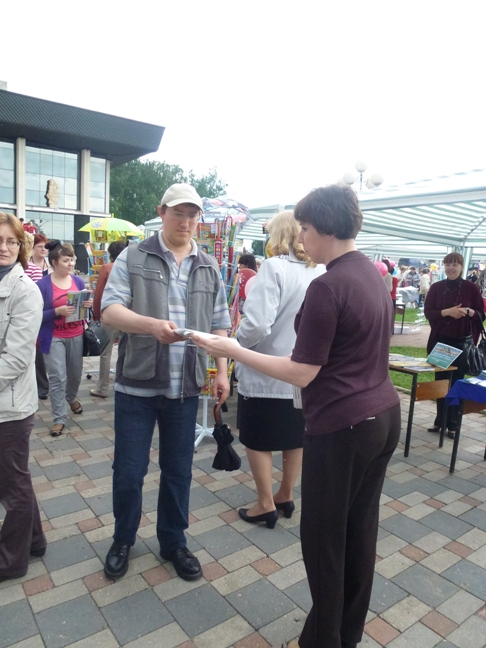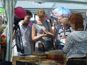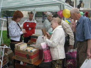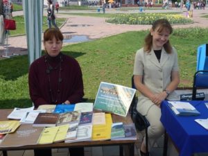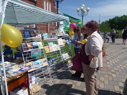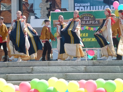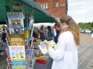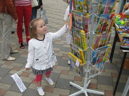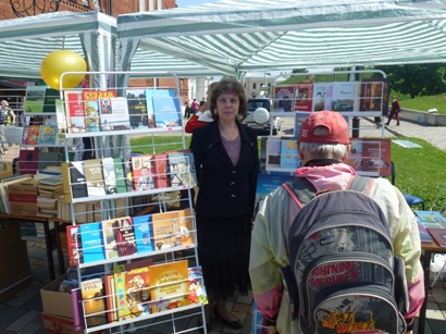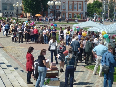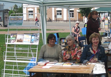 На главной площадке – торговой – можно было встретить известные в городе издательства и книжные магазины. Привлекали внимание посетителей товары для праздника, игрушки и сувениры, и конечно же, яркие обложки детских книг, краеведческая литература, сборники владимирских авторов. Очень заинтересовали многих специальные книги для слабовидящих людей: их текст набран азбукой Брайля, т.е. буквы представлены определенным набором выпуклых точек. Пользовались спросом красочные справочные издания по истории, искусству, естествознанию и другим разделам. Редакции газет представили свежие выпуски периодики и для желающих оформляли подписки. Около прилавка букинистического магазина царила оживленная атмосфера: каждый владимирец знает, что в подобных местах можно найти и букварь советского издания, и любимую книгу детства, и полную подборку зарубежной и российской фантастики, и роскошный альбом произведений искусства по вполне приемлемой цене.