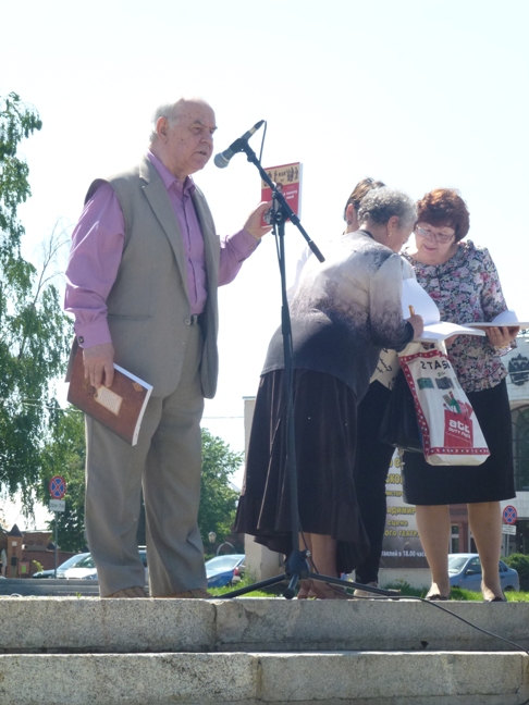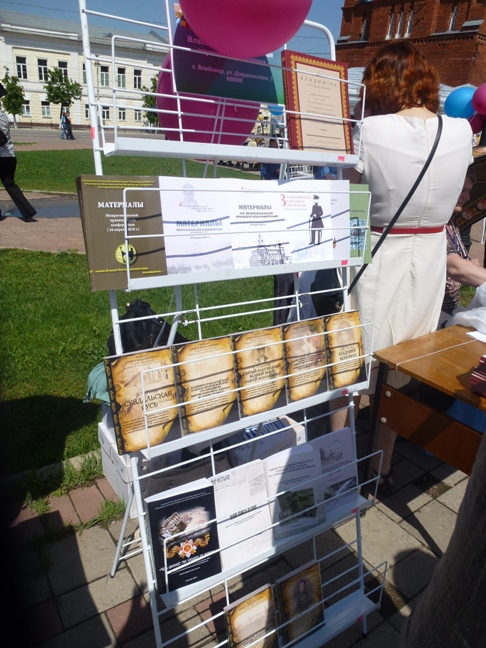 Также на главной площадке праздника состоялись презентации книг. Первыми поднялись на сцену под аплодисменты супруги Сухаревы – известный владимирцам «творческий тандем». Клара Семеновна – журналист, автор книг и нескольких вышивальных техник, обладатель звания «Мастер декоративно-прикладного творчества Владимирской области», лауреат всероссийских и международных премий. Она представила свою книгу «Шелковые мысли: о вышитых экслибрисах». Александр Петрович – заслуженный юрист России, член Союза писателей России и Союза журналистов. В свой черед он представил две своих новых книги: «Да ведают потомки православных: о летописях Владимирской земли и геральдике» и «В памяти моей: повести и рассказы». Супруги не только рассказали о создании книг и о своей совместной работе, но и разыграли свежеотпечатанные авторские экземпляры среди зрителей. Радостные обладатели выигрышей фотографировались с авторами и благодарили за их труд на благо Владимирской земли.