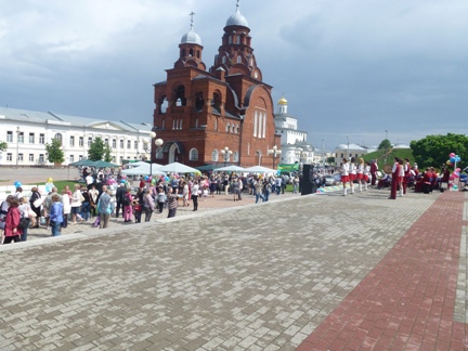 В этом году действо в центре города было посвящено празднованию 1150-летия со времени возникновения славянской письменности. Накануне, 24 мая, в храмах Владимира прошли богослужения, посвященные памяти святых равноапостольных Кирилла и Мефодия, а в светских учреждениях образования и культуры – концерты, круглые столы, беседы, семинары, чтения, встречи и выставки книг, приуроченные ко Дню славянской письменности и культуры. Участники ярмарки тоже внесли свою лепту: с главной сцены прозвучали торжественные слова в честь просветителей славяских стран и рассказ о начале празнования юбитейной даты в Риме. Именно там, в одном из центральных храмов – Санта-Мария Маджоре – в 867 году, когда в Рим прибыли святые равноапостольные братья Кирилл и Мефодий, впервые прошла литургия на церковнославянском языке. Кроме того, именно в итальянской столице покоятся мощи святого Кирилла – в крипте католического храма во имя святителя Климента. Ежегодно в день памяти равноапостольных братьев там проходит православное богослужение.