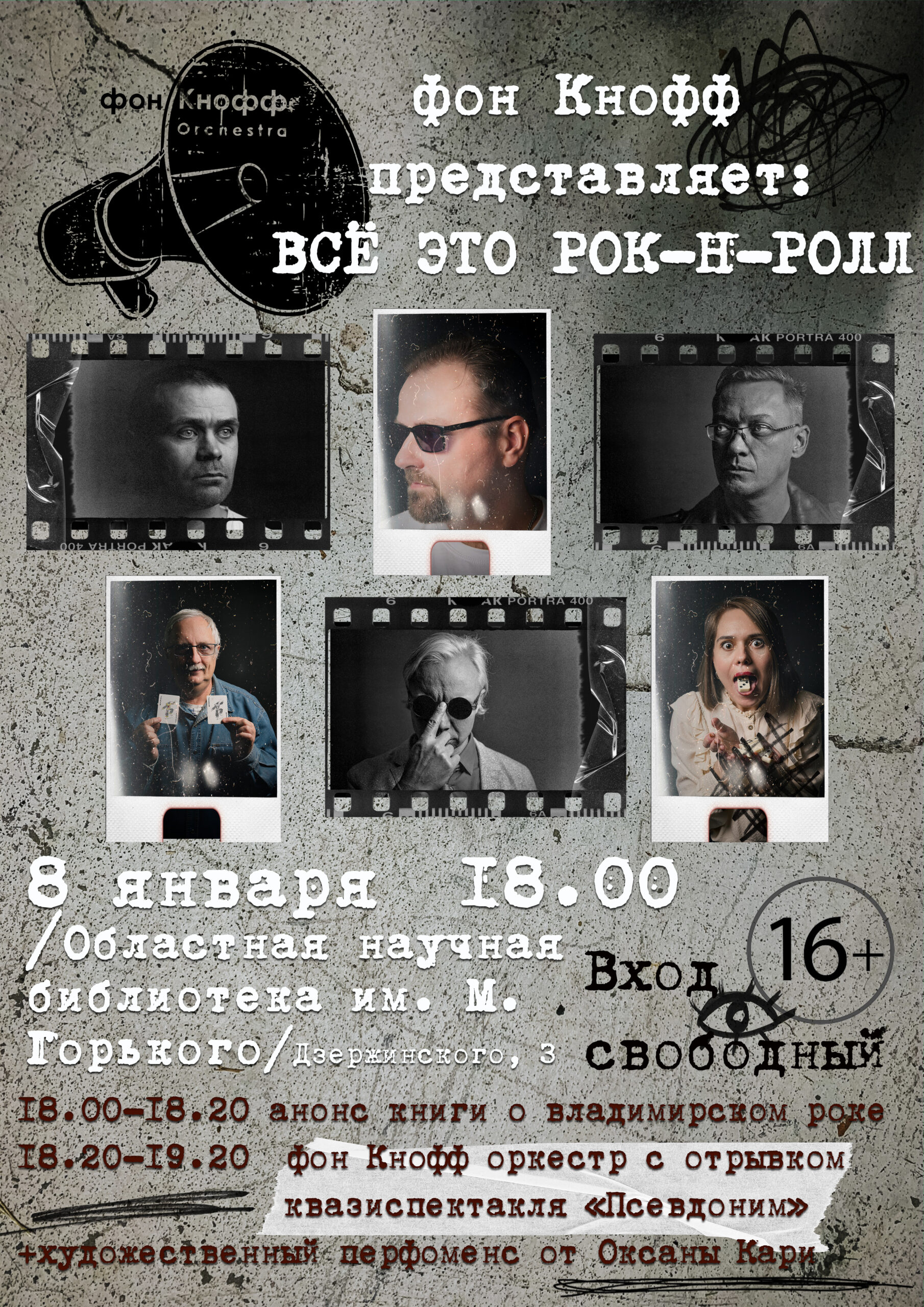 Всё это рок-н-ролл! Ждём всех на встречу с владимирской рок-группой «фон Кнофф оркестр» и другими известными музыкантами Владимира, которые анонсируют амбициозный проект, посвящённый истории рок-движения в нашем городе. Среди авторов проекта – Олег Дунаев, Александр (Семён) Семенович, Стас Кондаков, Владимир Михайлов и другие знаковые фигуры владимирской рок-сцены.