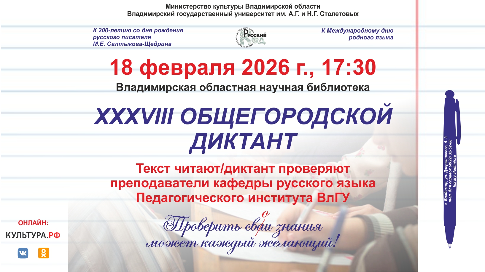 ХХХVIII Общегородской диктант, приуроченный к Международному дню родного языка и 200-летию со дня рождения русского писателя М.Е. Салтыкова-Щедрина, состоится в библиотеке 18 февраля 2026 г. в 17:30.