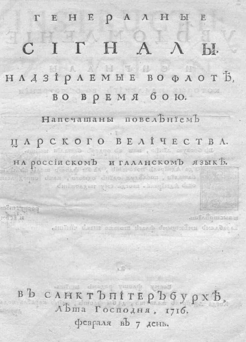 Источник: Устав о воисках морских, и о их арсеналах. Людовика Четвертаго надесять короля французского и наварскаго. Санкт-Петербург, 1715. 518, 9 [3] с.