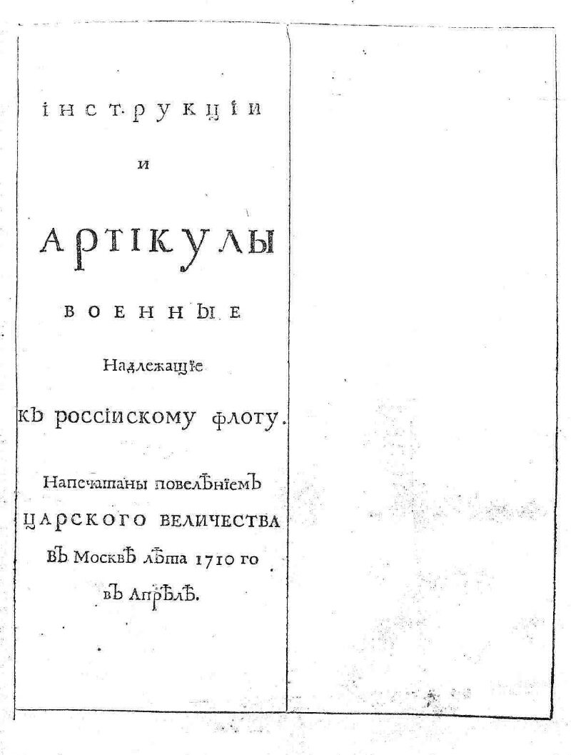 В 1710 году появился новый документ – «Инструкции и артикулы военные надлежащие к российскому флоту», в котором закрепляются дисциплинарные нормы. В 64 статьях расписаны обязанности чинов флота, а также наказания за проступки. Он издавался на русском и голландском языках.