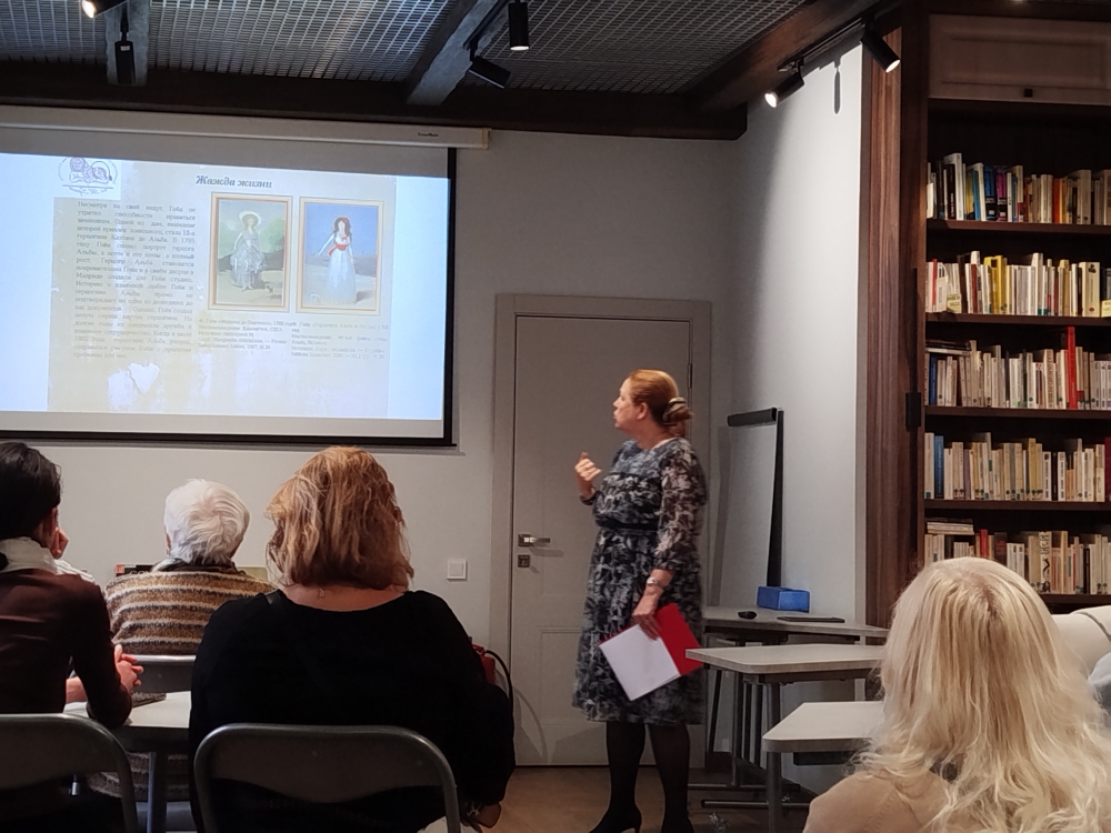 Участники мероприятия в ходе беседы «приоткрыли» удивительные страницы личной истории художника. Их не оставил равнодушными рассказ о судьбе дочери Гойи, Росарио Вайс, известной испанской художницы. Читателей, безусловно, заинтересовала легенда о загадочных взаимоотношениях мастера и его покровительницы герцогини Альба. Также неразгаданная история женского портрета актрисы Антонии Сарате в российском собрании картин в Эрмитаже чрезвычайно удивила гостей. И, конечно, трагическая загадка «черных картин» Гойи оказала на всех сильное впечатление.