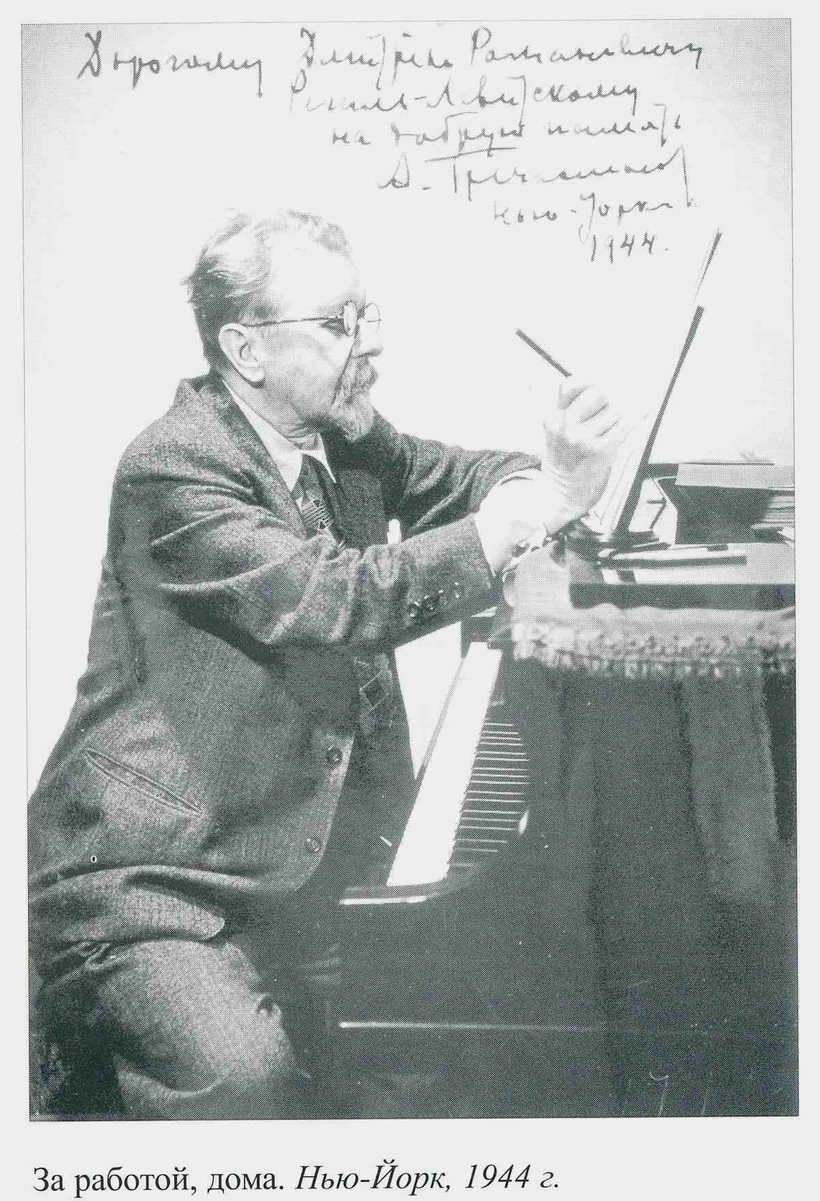 Александр Тихонович Гречанинов (1864, Калуга — 1956, Нью-Йорк) — русский композитор, автор 5 симфоний, 6 опер, 4 литургий, 5 месс, а также камерной и вокальной музыки. Учился в Московской и Петербургской консерваториях (последнюю окончил в 1893 г.), в 1925 г. уехал из СССР, с 1939 г. жил в США.