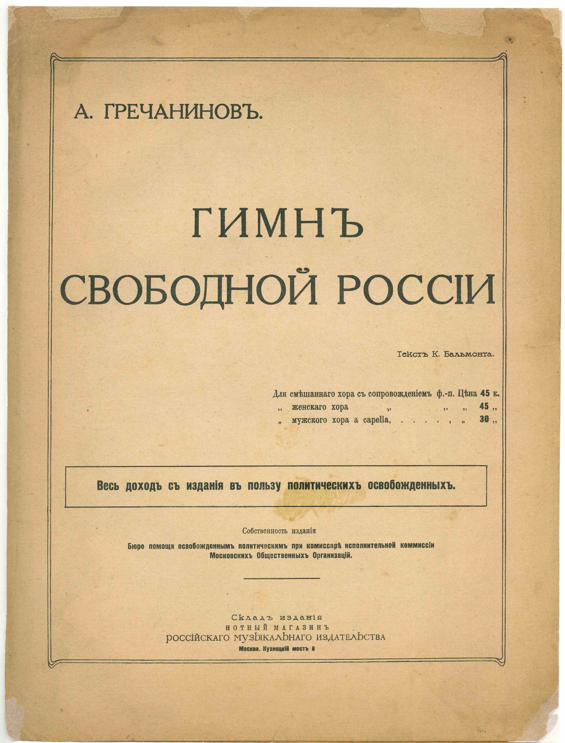 Источник: Гречанинов, А. Т. Гимн свободной России[Ноты]. М. : Российское музыкальное изд-во, [1917]. Тит. л.