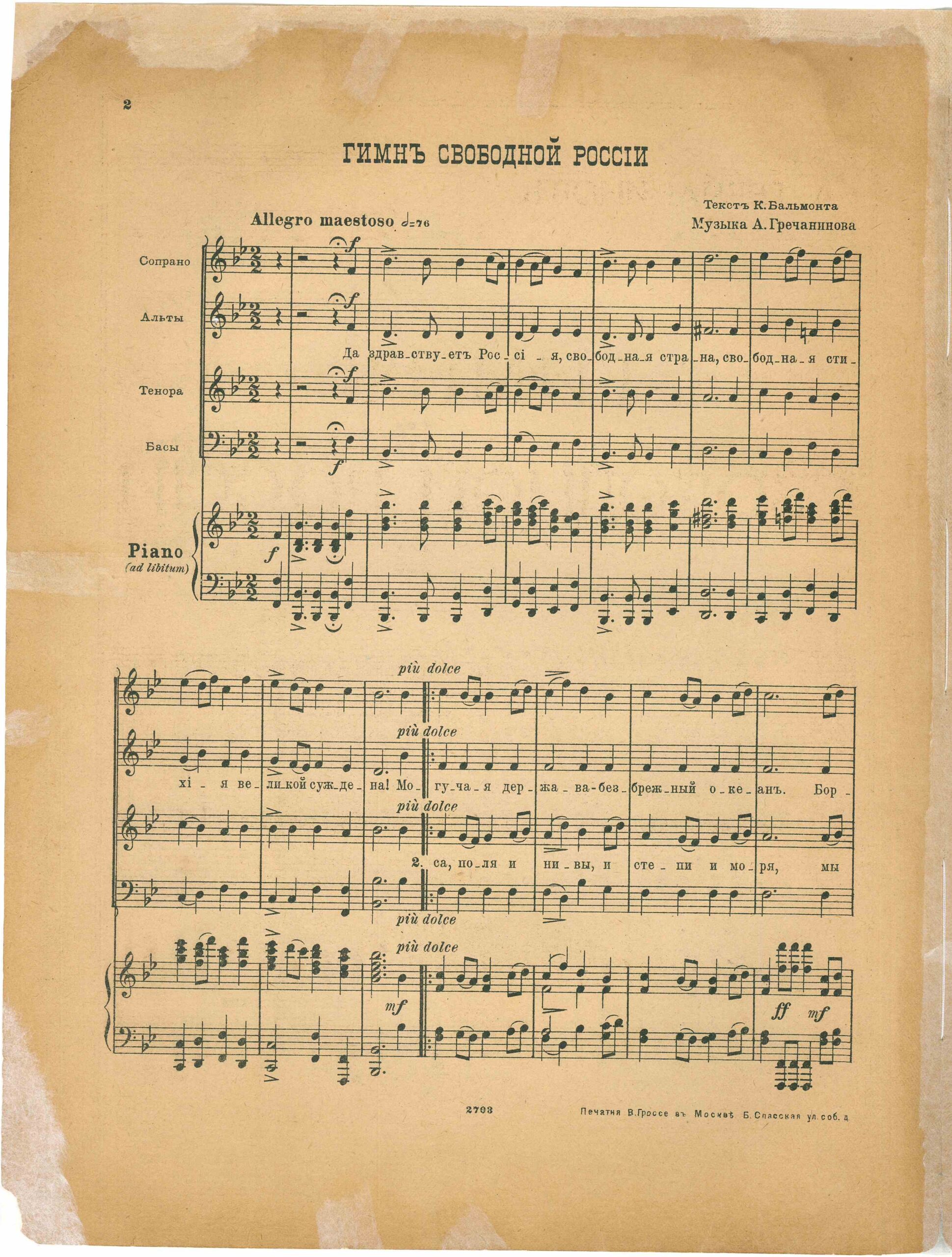 Источник: Гречанинов, А. Т. Гимн свободной России [Ноты]. М. : Российское музыкальное изд-во, [1917]. С. 2
