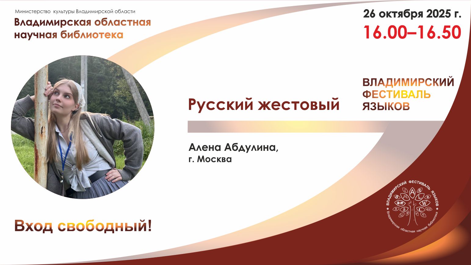 26 октября 2025 года в 16:00 приглашаем во Владимирскую областную научную библиотеку на лекцию Алёны Абдулиной «Русский жестовый язык».