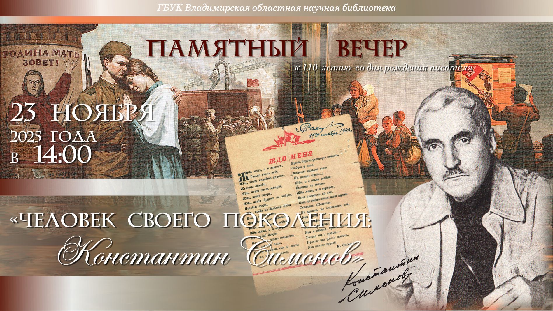23 ноября 2025 года в 14:00 состоится памятный вечер «Человек своего поколения: Константин Симонов». 28 ноября исполняется 110 лет со дня рождения советского писателя, поэта-фронтовика, драматурга, киносценариста, общественного деятеля, журналиста и военного корреспондента Константина Михайловича Симонова.