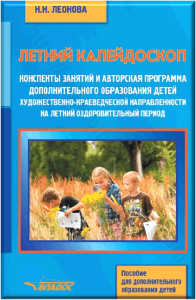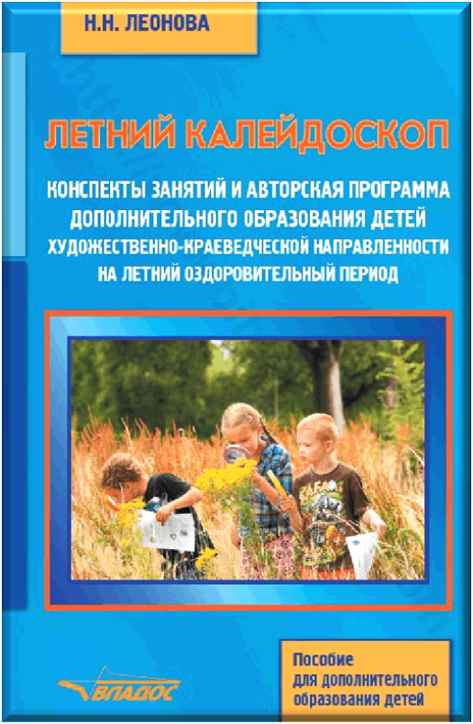 Леонова Н.Н. Летний калейдоскоп. Обложка книги с изображением детей на лугу, которые что-то ищут с лупой и путевыми листамиЛеонова Н. Н. Летний калейдоскоп. Конспекты занятий и авторская программа дополнительного образования детей художественно-краеведческой направленности на летний оздоровительный период : учеб. пособие. — М. : Издательство ВЛАДОС, 2018. — 117 с.