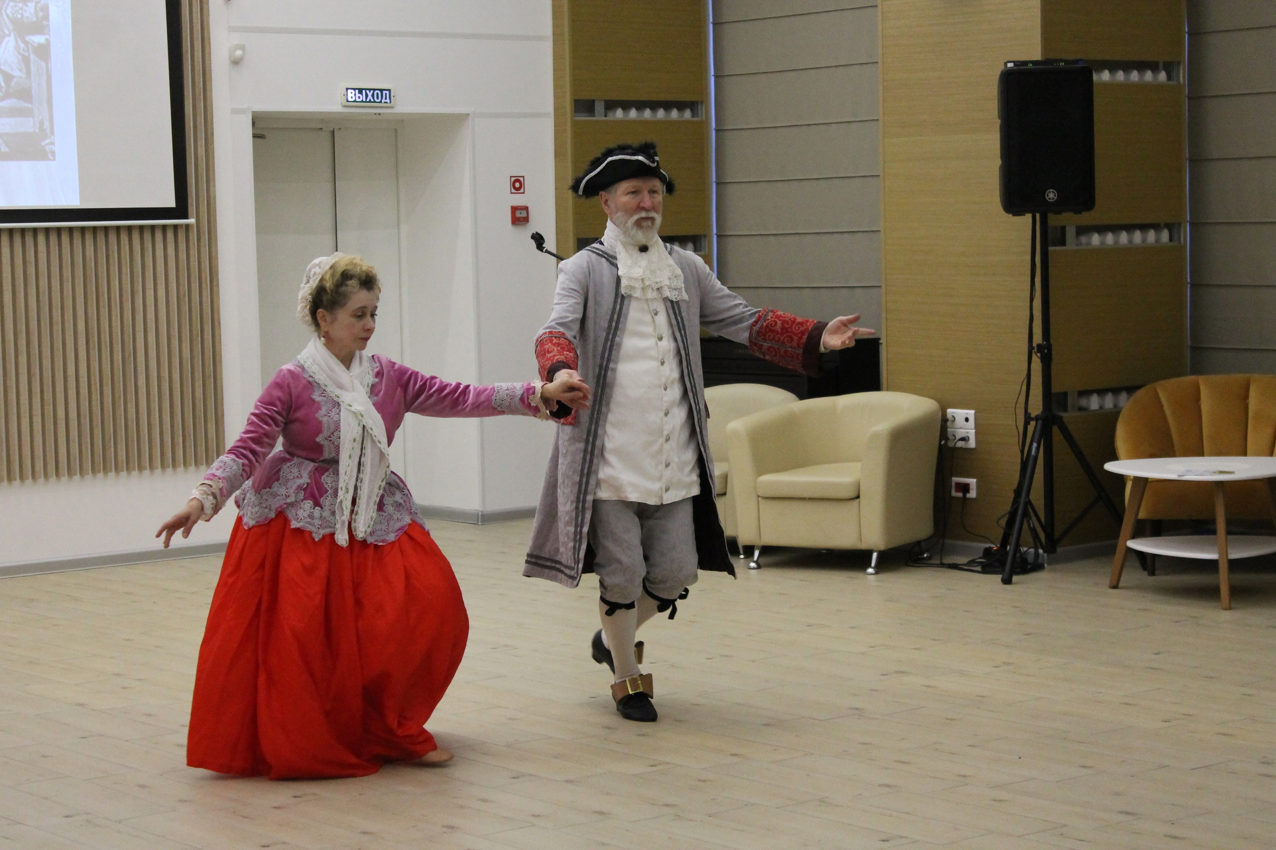 Далее, в продолжение праздника, двери распахнул «бальный зал». Участники всех возрастов не только услышали рассказ о танцевальной культуре, но и стали участниками интерактивного представления. Клуб исторического и социального танца представил нетривиальную программу танцев, состоящую из «полонеза», «менуэта» и забытого «контрданса». Затем, все без исключения читатели , взявшись за руки «выписывали» на паркете замысловатые «па» танцев Петровской эпохи. Представление завершилось небольшим «фуршетом», где танцоры и читатели смогли насладиться чаем и маленькими пирожными.