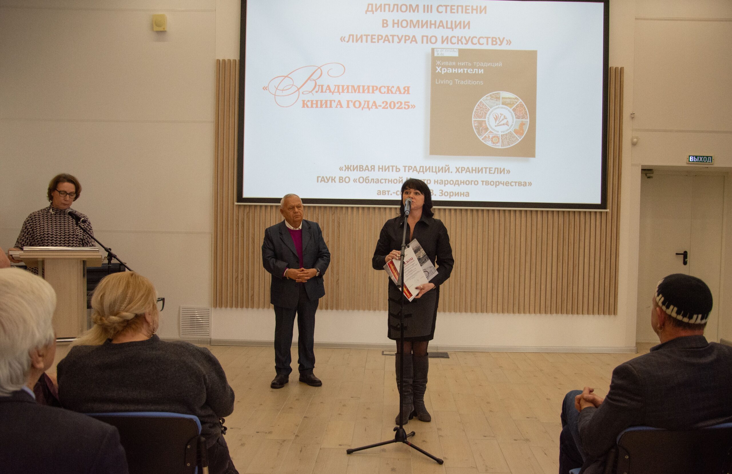 представил Малыгин Виктор Трофимович, доктор филологических наук, профессор, Почётный работник высшего профессионального образования РФ, заслуженный деятель искусств республики Дагестан. Он вручил Дипломом победителя 3 степени книге «Живая нить традиций. Хранители», изданной Государственным автономным учреждением культуры Владимирской области «Областной Центр народного творчества», директор которого Оксана Викторовна Зорина выступила автором-составителем.