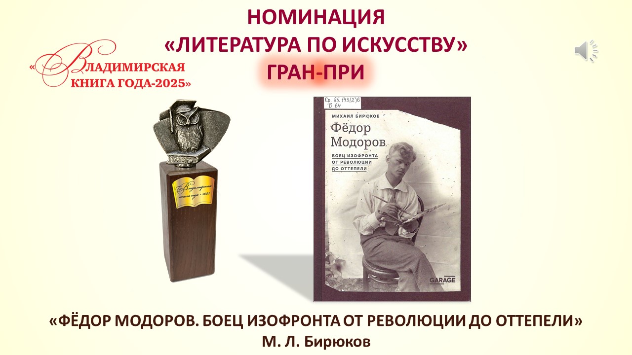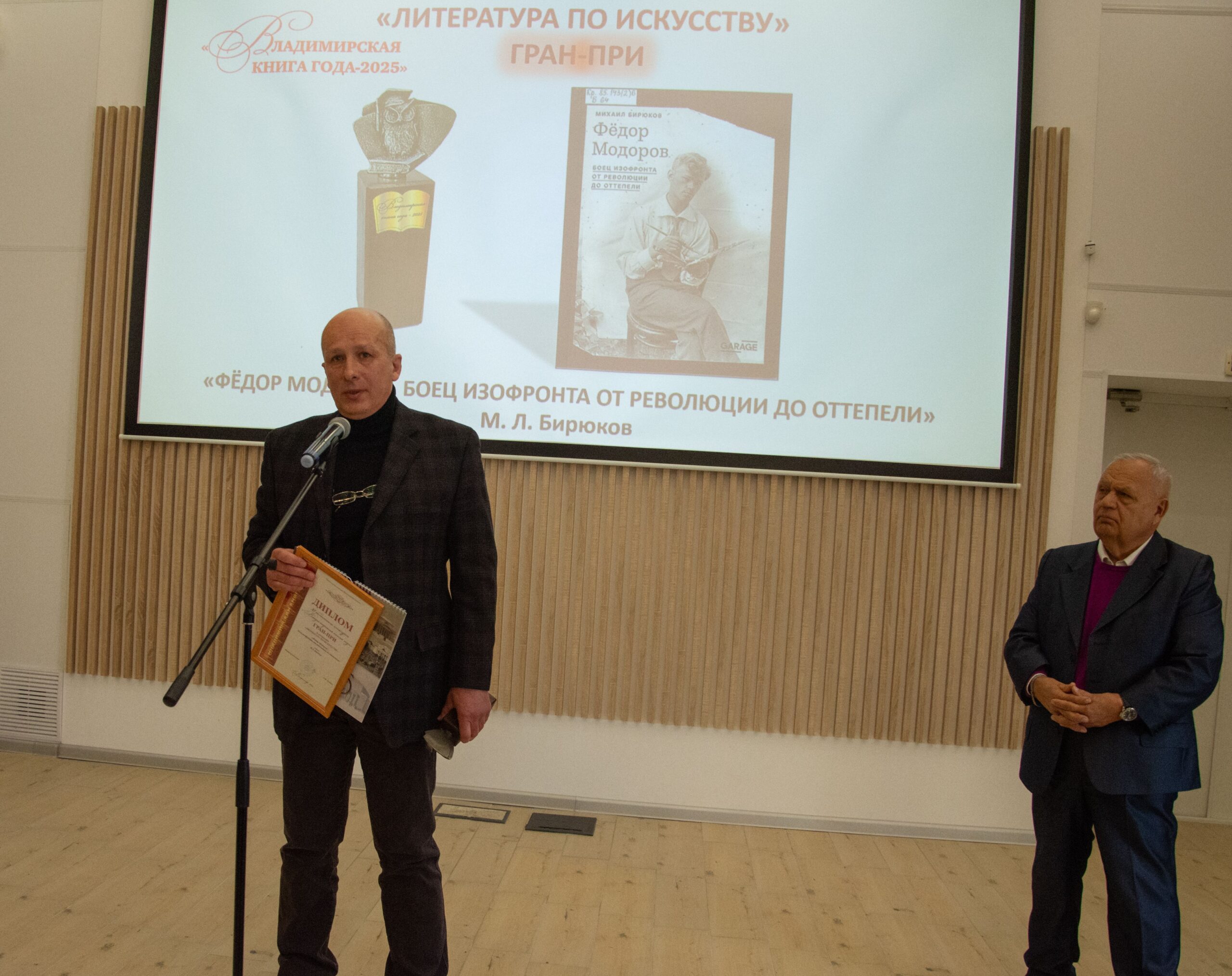 В данной номинации конкурсная комиссия приняла исключительное решение присудить ГРАН-ПРИ книге «Фёдор Модоров: боец изофронта от революции до оттепели», автор Михаил Львович Бирюков! Эта книга – рассказ о художнике на фоне и в контексте той эпохи, когда он жил, попытка осмыслить его судьбу с опорой на первоисточники, которые были собраны благодаря настойчивому, кропотливому труду автора по поиску и изучению материалов о жизни уроженца поселка Мстёра, народного художника РСФСР, ректора Московского Суриковского института, члена-корреспондента Академии художеств СССР Федора Александровича Модорова.