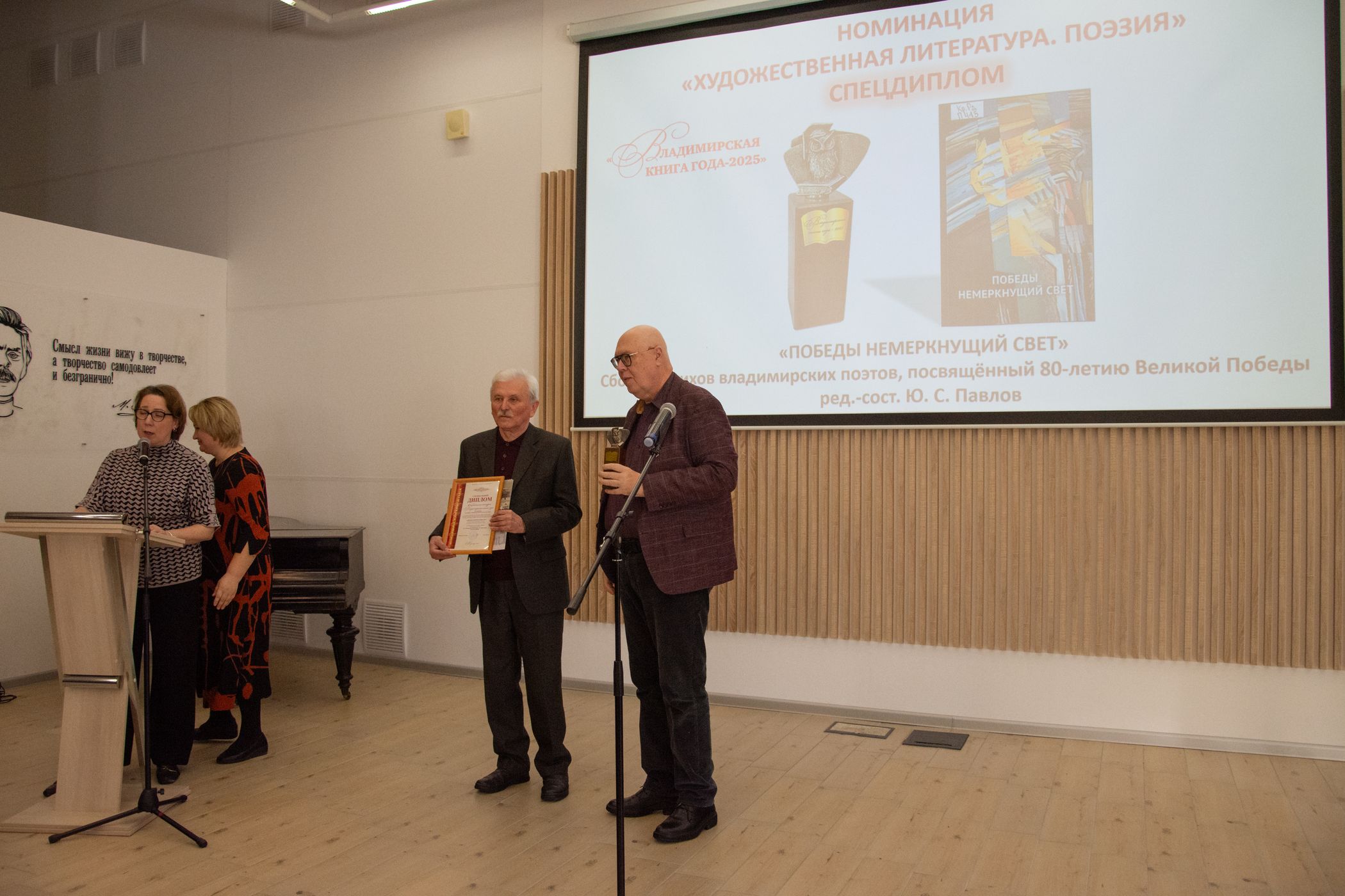 Спецдипломом конкурса награждена книга «Победы немеркнущий свет»: сборник стихов владимирских поэтов, посвящённый 80-летию Великой Победы, редактор-составитель Юрий Павлов, редколлегия: В. Забабашкин, Д. Кантов и др.
