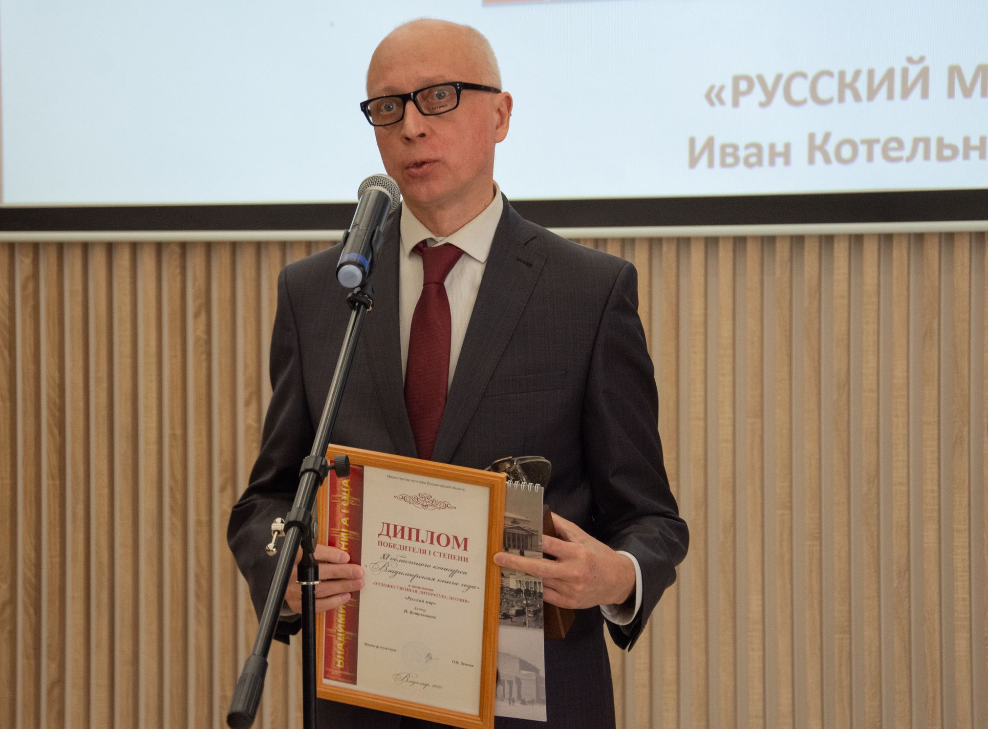 на сцену вышел председатель Владимирского отделения Союза российских писателей, поэт Дмитрий Владимирович Кантов. Он вручил Дипломы номинантов книгам: «Лукерья. Роман, которого нет», автор Игорь Игоревич Жаров; «Миниатюры от миниатюриста», автор Юрий Анатольевич Лебедев; «Муха, Ваза и прочие Лошади», автор Ясна Малицкая.