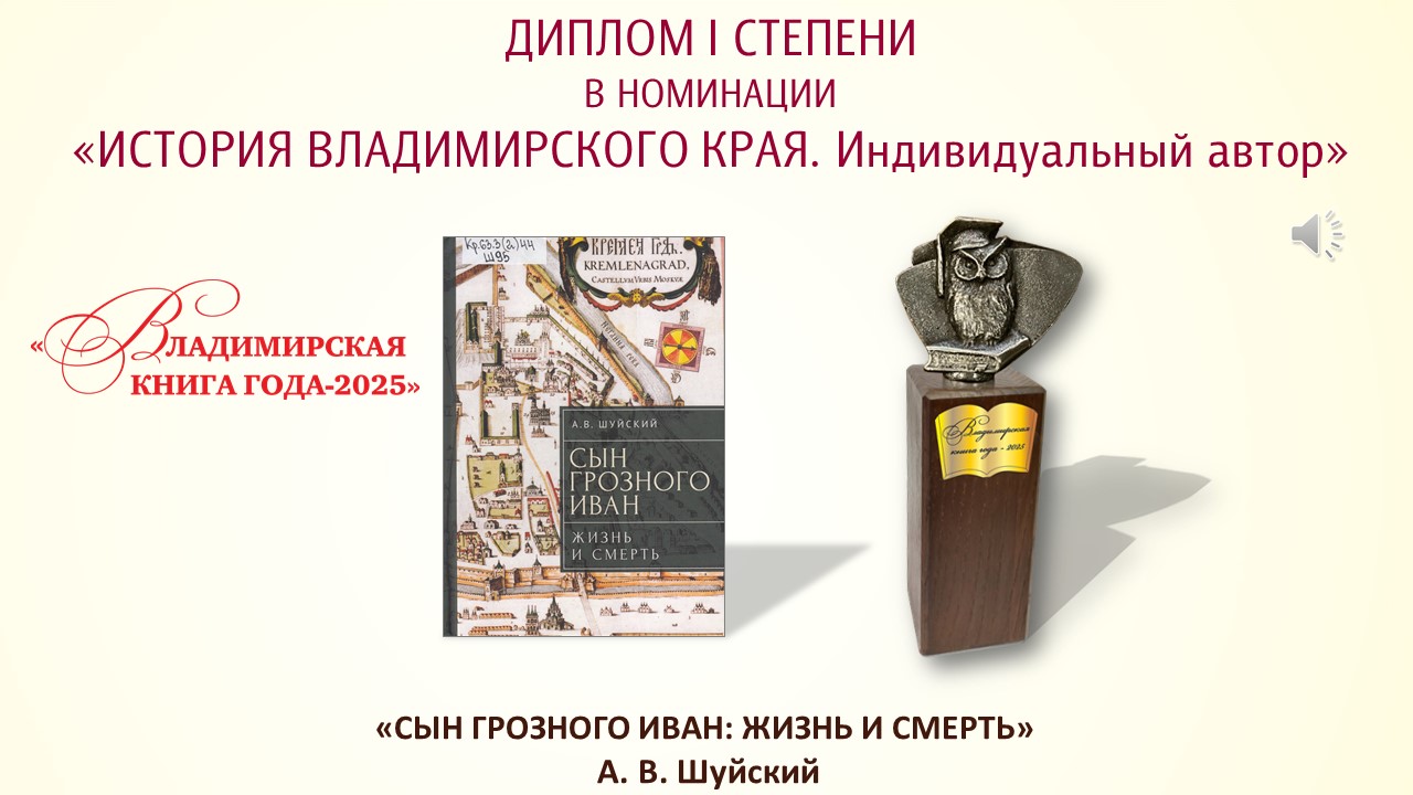 Диплом 1 степени и памятный знак вручены изданию ««Сын Грозного Иван: жизнь и смерть», автор Андрей Валентинович Шуйский.