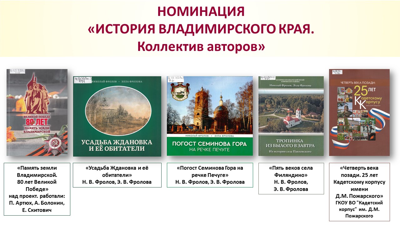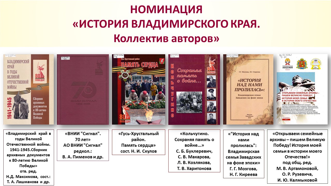 дипломом номинанта отмечены книги: «Владимирский край в годы Великой Отечественной войны. 1941-1945». Сборник архивных документов к 80-летию Великой Победы. Министерство по организации деятельности мировых судей, органов ЗАГС и архивов Владимирской области, ГБУВО «Государственный архив Владимирской области, ответственный редактор Наталия Дмитриевна Максимова и коллектив составителей; «Открываем семейные архивы – пишем Великую Победу! История моей семьи в истории моего Отечества!», сборник материалов VI Областного конкурса научных и творческих работ учащихся старших классов общеобразовательных школ, студентов, преподавателей, выпускников организаций высшего образования и профессиональных образовательных организаций Владимирской области, посвященного 80-летию Победы в Великой Отечественной войне и Году защитника Отечества, подготовленный Владимирский филиал ФГБОУ ВО «Российская академия народного хозяйства и государственной службы при Президенте Российской Федерации» (директор Вячеслав Юрьевич Картухин) под общей редакцией: Марины Владимировны Артамоновой, Олега Руслановича Рузевича, Ирины Юрьевны Калмыковой; «Память земли Владимирской: 80 лет Великой Победе», над проектом работали: Полина Артюх, Александр Болонин, Евгений Скитович; «Усадьба Ждановка и ее обитатели», «Погост Семинова Гора на речке Печуге» и «Пять веков села Филяндино» авторы: Николай Владимирович и Элла Владимировна Фроловы; «Четверть века позади: 25 лет Кадетскому корпусу имени Д.М. Пожарского» ГКОУ ВО кадетская школа-интернат «Кадетский корпус» им. Д.М. Пожарского в ЗАТО г. Радужный (директор Михаил Данилович Михайлов).